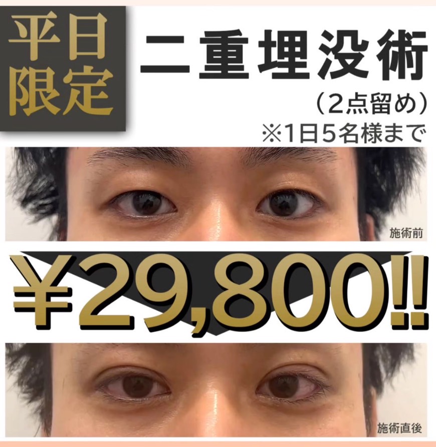 キャンペーン情報平日のみキャンペーン! 2024.04.02 Tweet Share本日は4月1日から始まったキャンペーンについてお知らせしますそれは二重埋没法二点留め!一日5名様限定!!当院の医師は手先が器用で有名です。男女ともに目にコンプラックスがある方や整形しようかと悩んでいる方はぜひ!!!当院では、患者様一人ひとりの個別のニーズに応えるオーダーメイド治療を心掛けております。丁寧なカウンセリングと確かな技術で、理想の仕上がりを目指します。ご自身の美を追求されたい方は、ぜひ当院までお問い合わせください。何か不安や質問がある方はLINE追加から「ぷろたんに相談する」からご相談くださいねこちらはご予約フォームになります Tweet ShareプロクリニックPRO CLINIC包茎ペニスアートメイク二重二重埋没 [医師解説]包茎手術の術式について前の記事 【医師解説】ヒト表皮角化幹細胞と表皮再生について次の記事